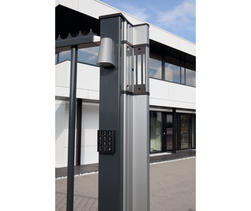 Dieses Locinox Aufputz-Magnetschloss mit silberfarbenen Griffen eignet sich zur Montage auf Vierkantprofilen von 40 bis 80 mm.