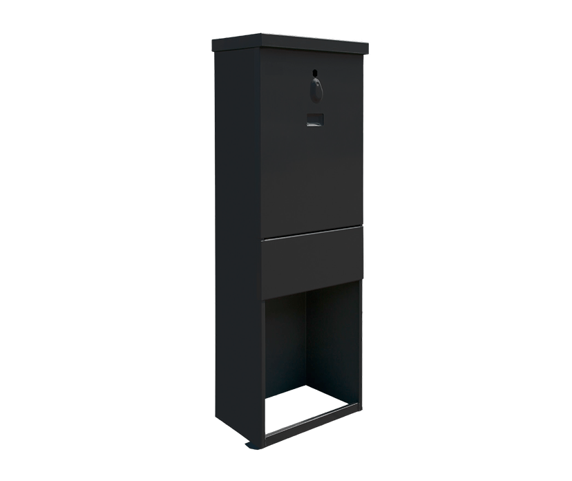 Der Kabelverteilerschrank aus Edelstahl in der Farbe RAL9005 eignet sich als Außengehäuse. Der Kabelverteilerschrank besitzt ein festes Fundament und eine Stecktür. Zudem wird der Kabelverteilerschrank aus Edelstahl mit Montageplatte, Schloss und Schlüssel geliefert. Der nutzbare Einbauraum beträgt etwa 80 % der angegebenen Tiefe.