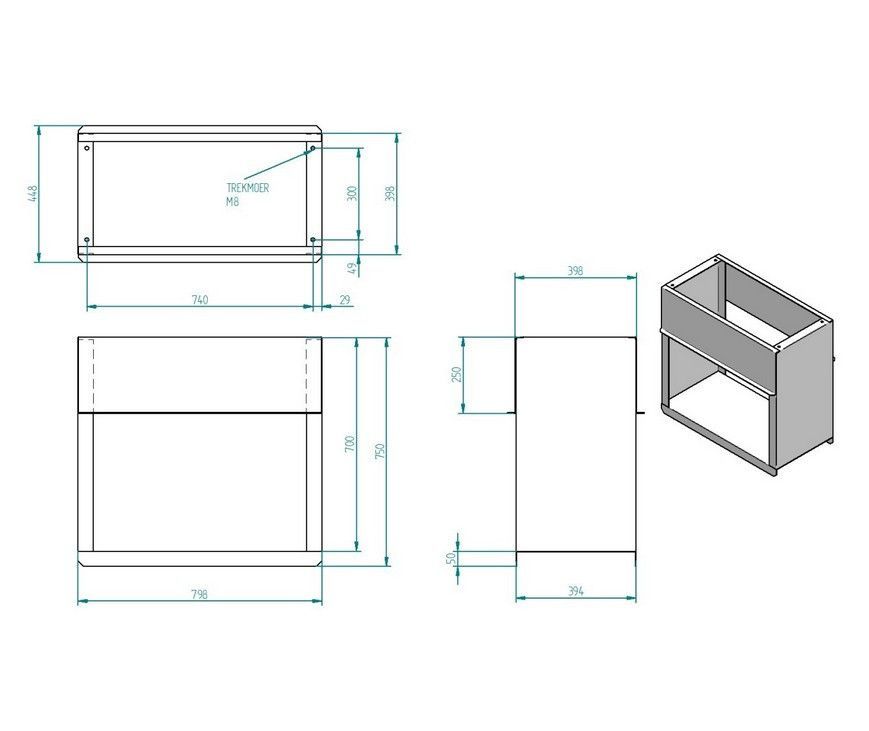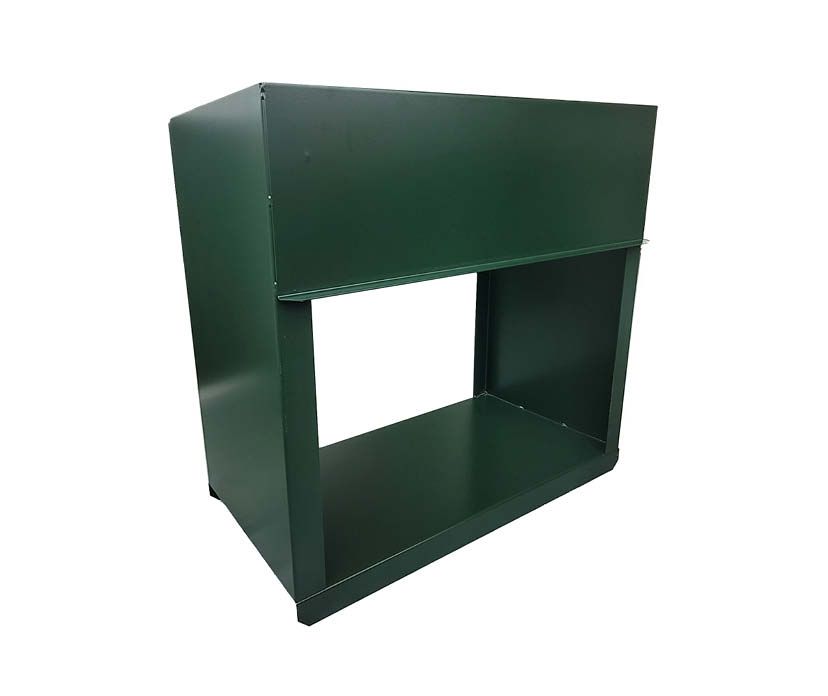 Zählerkastenfundament für den Kabelverteilerschrank 400806. Material Edelstahl304 beschichtet in RAL6009. Die Abmessungen betragen 750x800x400 mm.