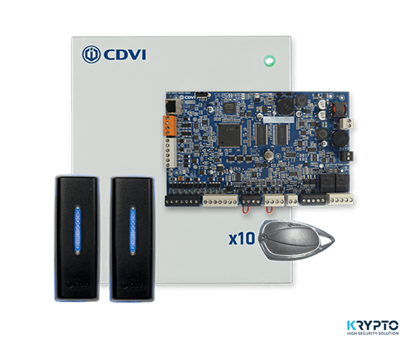 Das Kit Atrium Krypto A22K besteht aus einem Hochsicherheits-Zugangskontrollsystem mit zwei schwarzen K2-Lesern und zehn Atrium Krypto Zugangschips aus Metall.