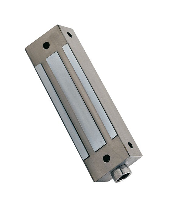 Edelstahl-Haftmagnet zum Aufbau, um Türen oder Tore bis zu 400 kg offen oder geschlossen zu halten. Vandalismusbeständig mit Signalrelais, Sicherheitskabeln und Ankerplatte. Bei Spannungsabfall wird die Tür sofort geöffnet. Sehr geeignet für den Außenbereich.
