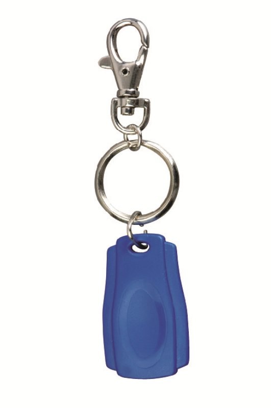 Transponderschlüssel 125KHz blau aus robustem Polycarbonat für Transpondertaster. Die Größe des Schlüsselanhängers beträgt 42x28x8 mm.