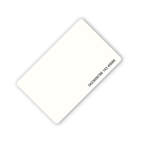 Standard-Transponderkarte ISO 0,8 mm dick 125 KHz in PVC für Transpondertaster. Die Größe der Karte beträgt 85x54x0,8 mm. Die Karten sind serienmäßig weiß und mit einer eindeutigen Nummer versehen. Ein Aufdruck in Vollfarben und ein Wunschdesign sind möglich.