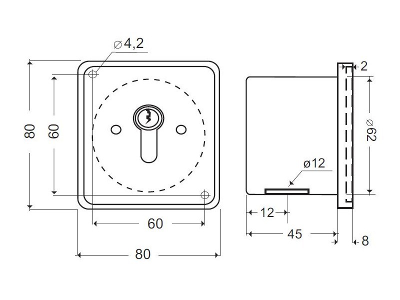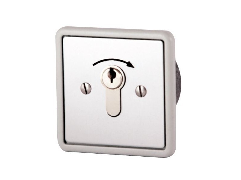 Schlüsselschalter zum Einbauen mit minimaler Tiefe und Euro-Profilzylinder. Mit Frontplatte aus Aluminium und 1 Impulskontakt. Der Schlüssel muss in vertikaler Position abgezogen werden.