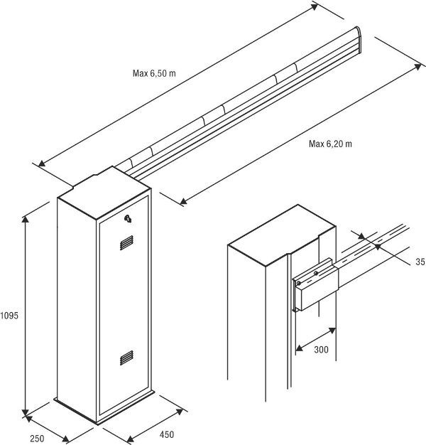 Die VE.650I ist eine einfache Schrankenanlage für eine Baumlänge von bis zu 6,5 Metern und geeignet für intensiven Gebrauch. Robustes Edelstahlgehäuse. Bei Stromausfall kann die Schranke manuell entriegelt werden. Die VE.650I ist mit einer integrierten Motorsteuerung ausgestattet, die alle Standardfunktionen sowie zwei verstellbare Endschalter umfasst. Für eine einfache Montage kann die optionale Fundamentplatte VE.P650 verwendet werden. Die Öffnungsrichtung lässt sich problemlos von rechts auf links umbauen. Aluminiumbaum nicht im Lieferumfang enthalten.