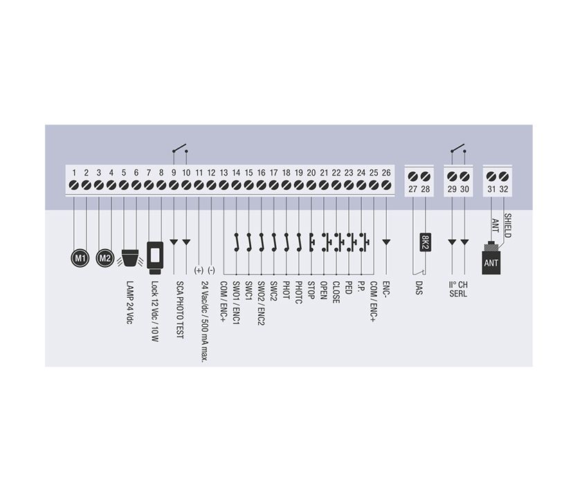 Umfassende 24-Vdc-Motorsteuerung mit integriertem Empfänger 433,92 MHz und Standard-8K2-Eingang. Die Programmierung diverser Funktionen erfolgt über ein LCD-Display. Für Einzel- und Doppeltore geeignet. Sowohl für mechanische als auch hydraulische Torantriebe verwendbar.