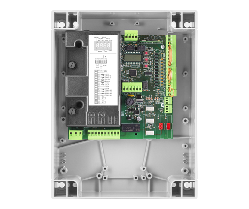 Das Kit DU.IT14NV ist ein Komplettset mit schnellen, zuverlässigen Unterflurmotoren. Die maximale Flügellänge beträgt 2,1 m. Die Länge vom Achsmittelpunkt zur Rückseite des Motorgehäuses beträgt 60 mm. Bei einem Stromausfall kann das Tor mit dem Spezialschlüssel manuell geöffnet und geschlossen werden. Die Motorgehäuse sind mit einer Elektrophorese-Behandlung versehen. Die BRAINY PLUS ist eine umfassende digitale Steuerung mit allerlei Funktionen, die sich einfach über ein Display programmieren lässt. Der 433,92-Mhz-Empfänger ist in die Steuerung integriert. Ein 2-Kanal-Handsender mit einzigartigem Rolling-Code ist im Standard-Lieferumfang inbegriffen. Wenn während der Bewegung Hindernisse erkannt werden, sorgen die mitgelieferten PUPILLA-Fotozellen für eine Umkehr des Tors.
