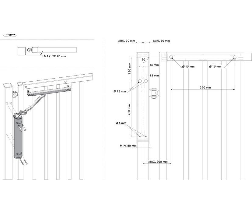 Er funktioniert sowohl mit 90°- als auch 180°-Scharnieren und eignet sich somit für unterschiedliche Anwendungen. Mit diesem Torschließer schließen Sie Tore immer sicher und kontrolliert, unabhängig von den Bedingungen.