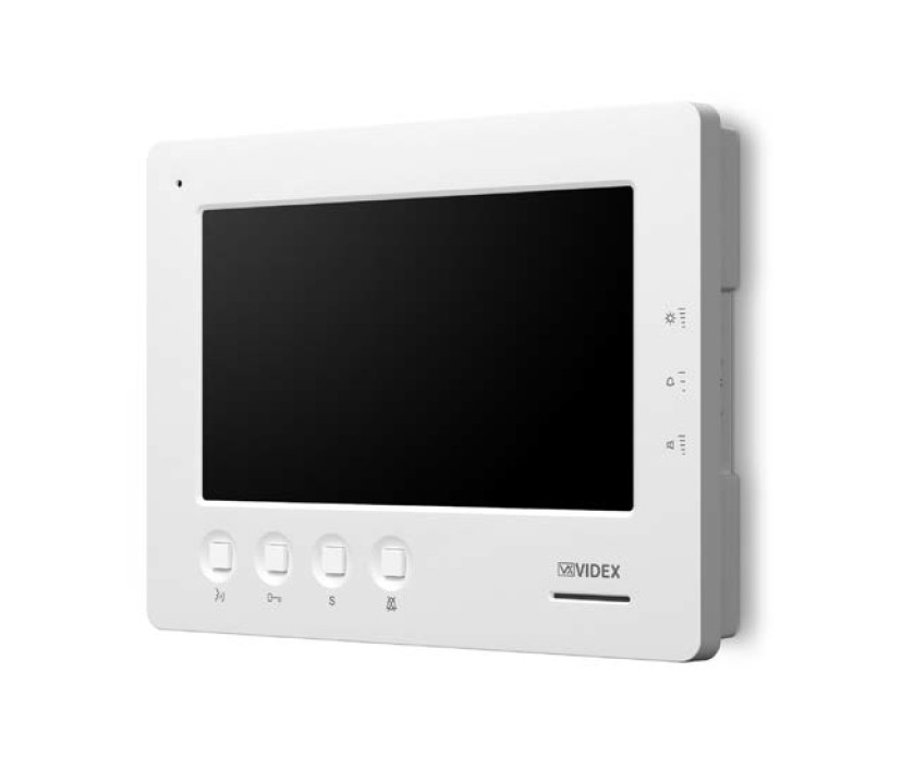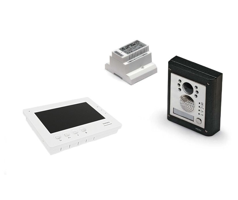 Komplettes VIDEX 4000 Serie Video-Türsprechanlagen-Set mit Hände frei Innenstation, ausgestattet mit einem großen 7"-Bildschirm. Die Unterputz-Außenstation verfügt über eine Klingeltaste, einen Lautsprecher und eine Kamera mit Infrarot-LED-Beleuchtung. Die Video-Türsprechanlage 6K7 Innenstation ist mit einem Farbmonitor, vier Drucktasten und zwei Status-LEDs ausgestattet. Die Lautstärke des Ruftons, die Helligkeit und der Kontrast sind einstellbar.