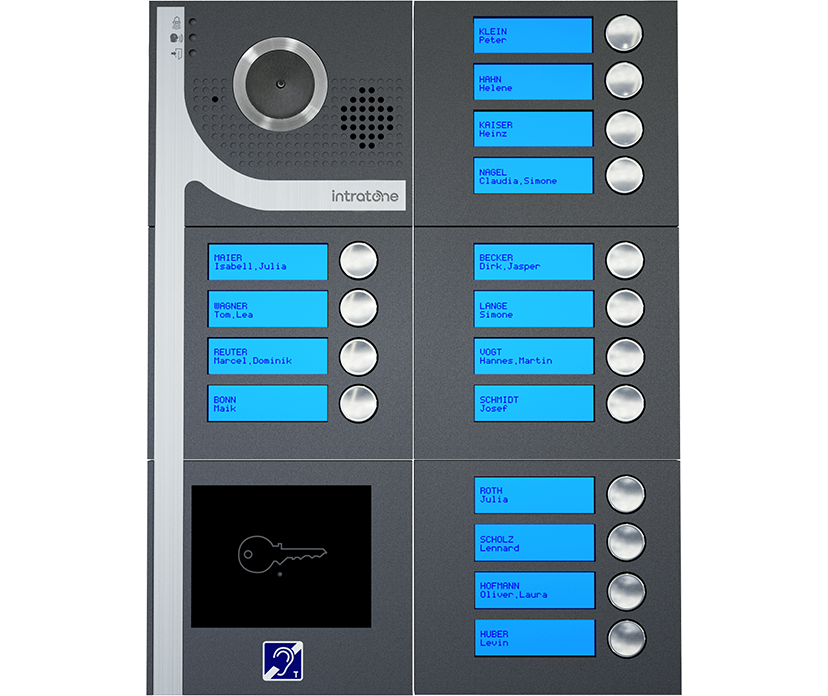Die 16 Klingeltasten sind mit einem LCD-Display ausgestattet, auf dem Namen digital angezeigt werden. Änderungen können einfach aus der Ferne über die Intratone-Plattform vorgenommen werden, ohne dass physische Anpassungen erforderlich sind.
