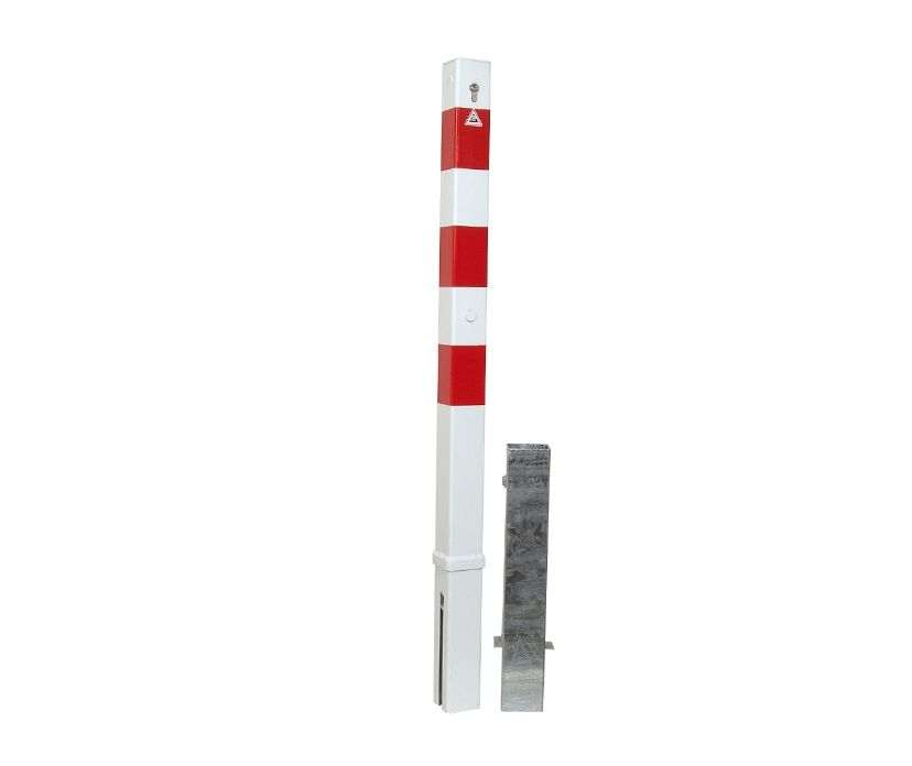 Quadratischer Parkpoller 70x70 mm. Der Parkpoller ist herausnehmbar und mit einem Europrofilzylinder ausgestattet. Er ist vollbadverzinkt und in Rot/Weiß beschichtet. Die roten Markierungen sind reflektierend, wodurch der Parkpoller auch bei Dunkelheit gut sichtbar ist. Die Verriegelung des Parkpollers erfolgt mühelos durch das selbstschließende Schloss. Der Parkpoller wird inklusive passendem Sockel geliefert.